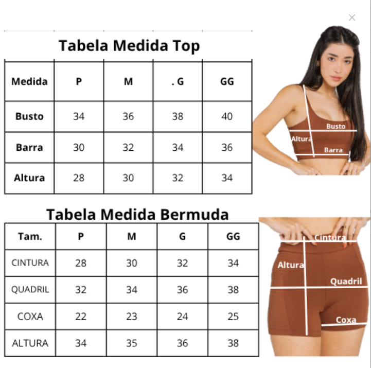 | Tamanho | Busto (cm) | Altura do Top (cm) |